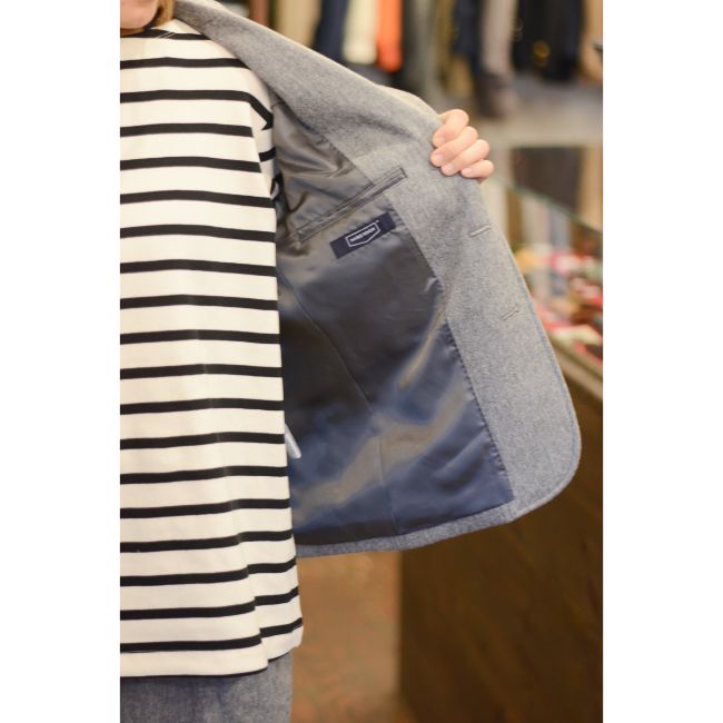 最小限の芯地と付属にて、着心地の良いフィット感と立体感を出すべく各工場での数多い中間プレスや、オーダーメイドのような手作業を重ねた最上級の製法技術を持つ工場で丁寧に仕上げられています。