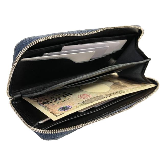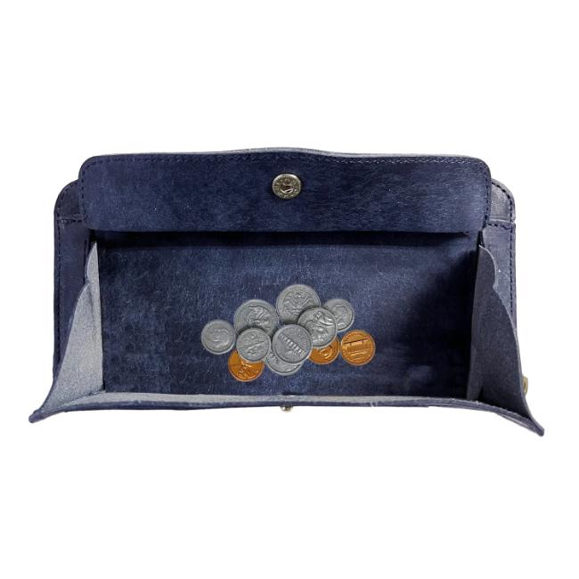 本体正面に配されたコインポケットは大容量でデザインのアクセントにもなっています。4辺が大きく開く仕様で見渡しやすく、取り出しやすい構造になっております。(写真8枚目)