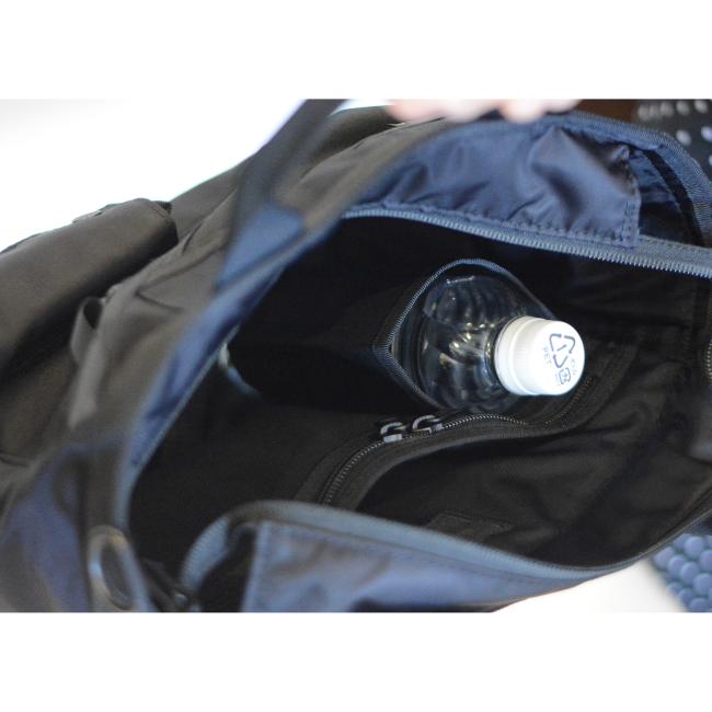 小さくてもしっかりと収納ができる様に、メイン収納部にはボトルホルダーを備え、オープンポケットとファスナーポケットを装備しているため、小物などの仕分けもできる設計になっております。