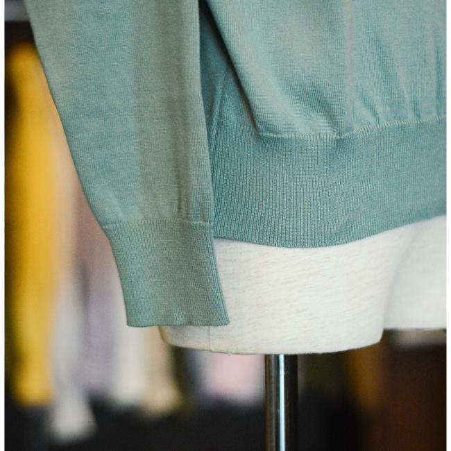 12ゲージの綿コーマ糸を度詰めに織り上げられており、ニットの上品さと、綿の特徴でもある着込むことで生まれる風合いの変化や着心地の良さを感じれる生地になっております。