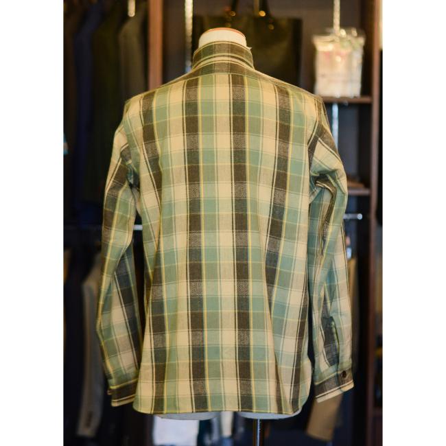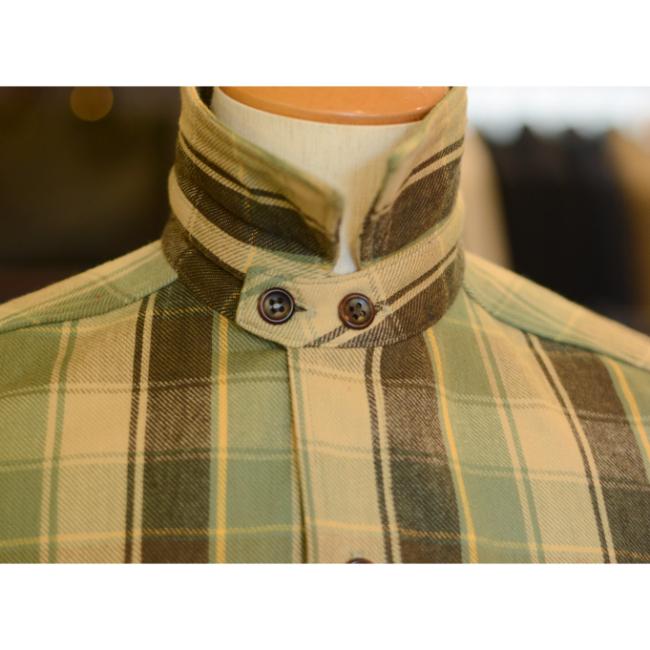 「ブレイブマン」という実在したワークウエアブランドの生地見本帳から、柄パターンをピックアップして、実在した同ブランドのチンストラップ型のシャツで再現しております。