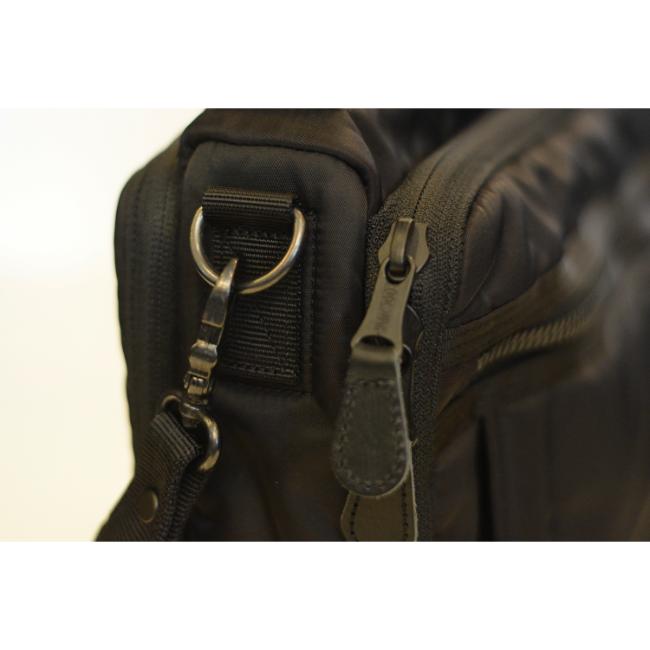 コーデュラ社のボンディング高密ナイロンをベースに、環境保護の観点からブルーサイン®基準を満たす認定工場で開発した、3層構造のオリジナル生地をメイン素材に使用しております。