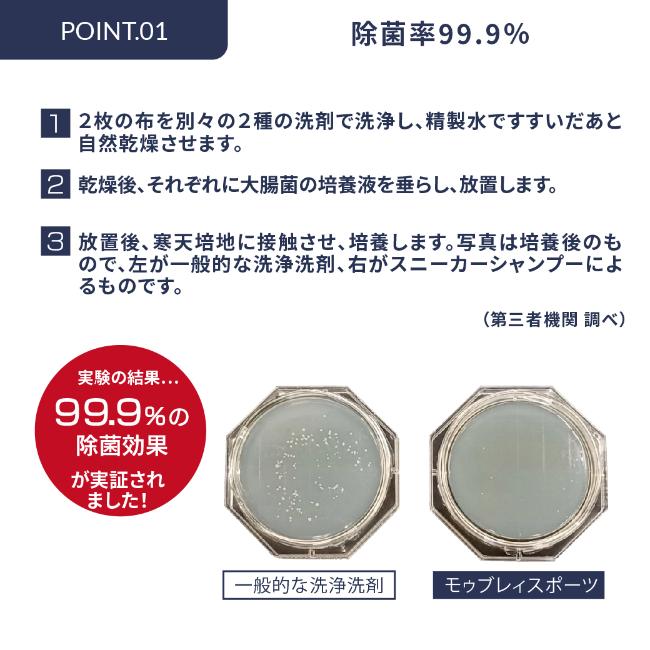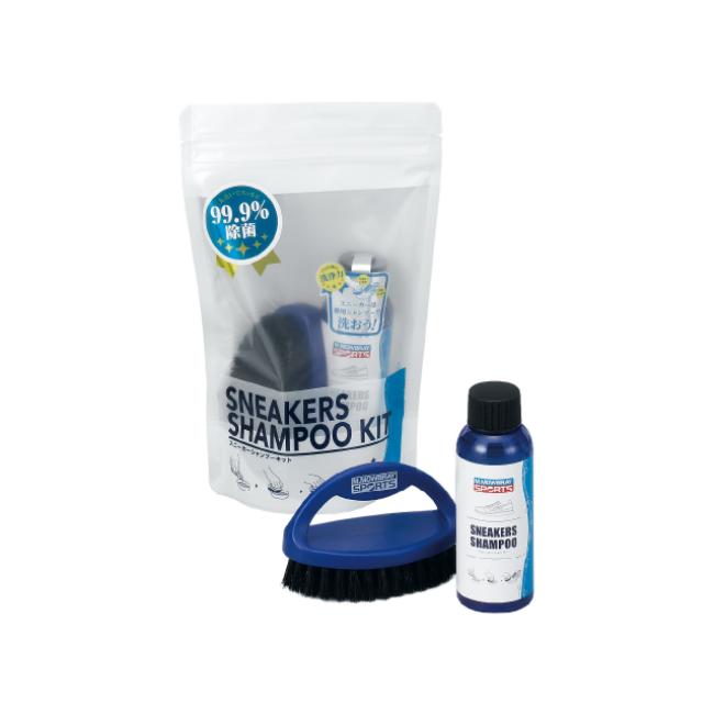 除菌率99.9%のスニーカーシャンプー(1本)と、汚れ落とし用のブラシ(1本)がセットになったクリーニング用キットです。