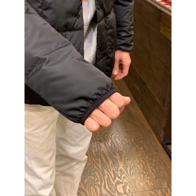 袖口と裾部には、シルエットを崩さない程度のゴムが入っていて、隙間を作らず温めた空気を逃さないようになっております。