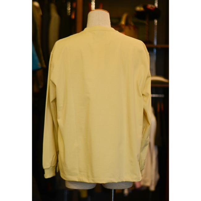 32/1の微強撚糸を引き揃えて編んだほどよく厚みがありながら、しなやかさ、光沢感のあるハイゲージの天竺(コットン100%)を使用しております。