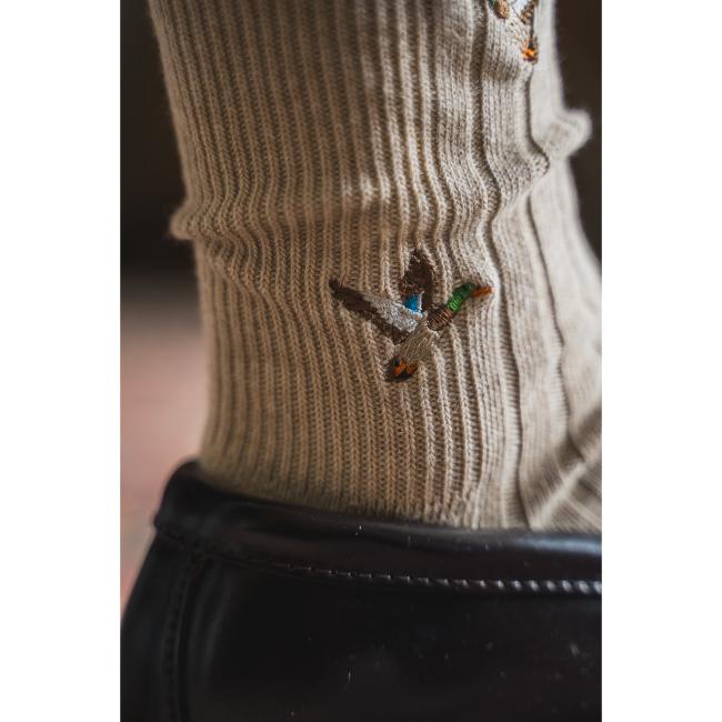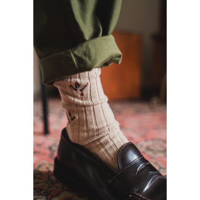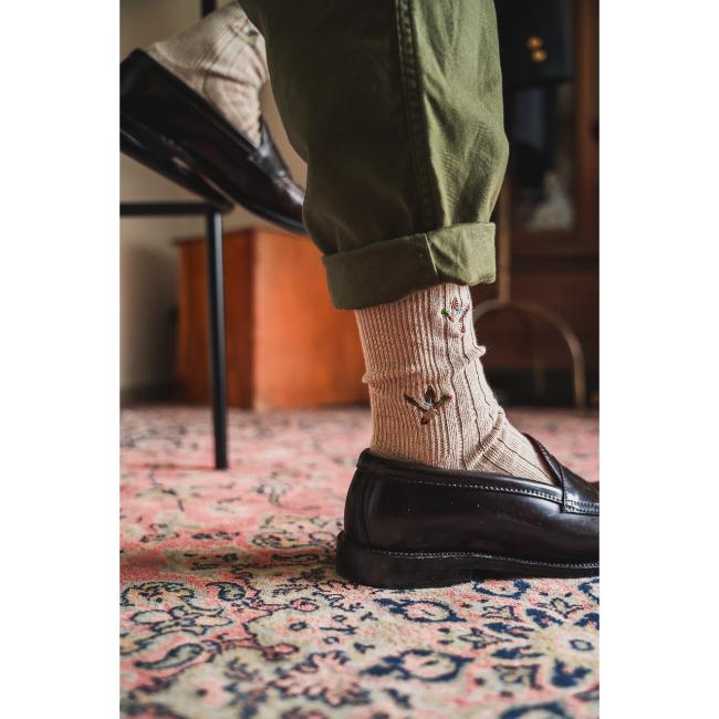 国内でも希少な本当のリブを編めるパイル機を使用して作られた刺繍ソックス
