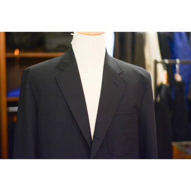 ナチュラルショルダー、前ダーツ無し、センターベント、段返り3つボタンを特徴とした型です。