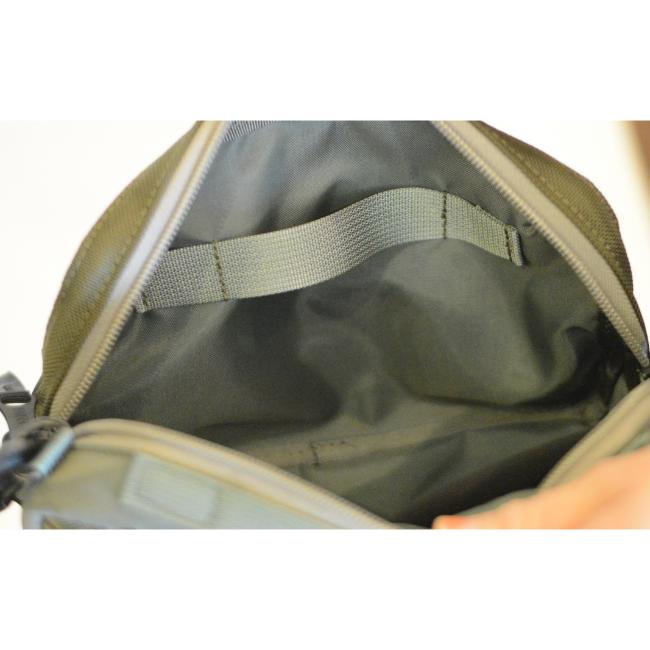 内装には伸縮素材を使用したオープンポケットと、カギなどを取り付けることができるストラップ付きのカラビナが付属しております。
