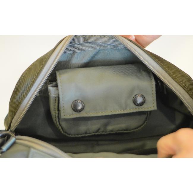 フロントのフラップポケットは脱着できる仕様になり内装へ取り付けることができます。