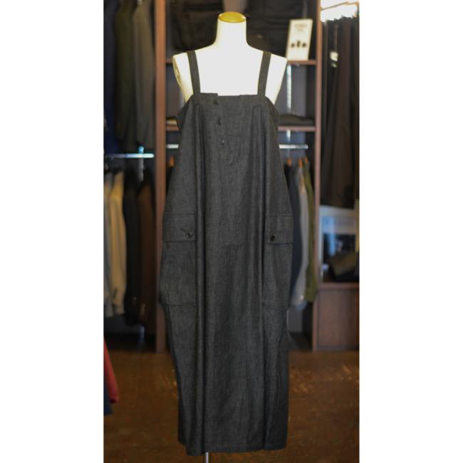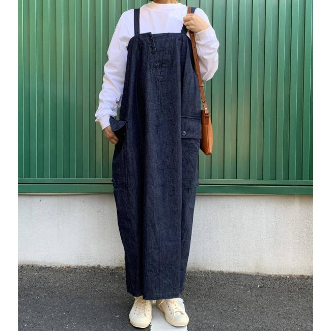 ライトオンスのデニムを使用した、軽やかな印象で着用できるロングサロペットスカート