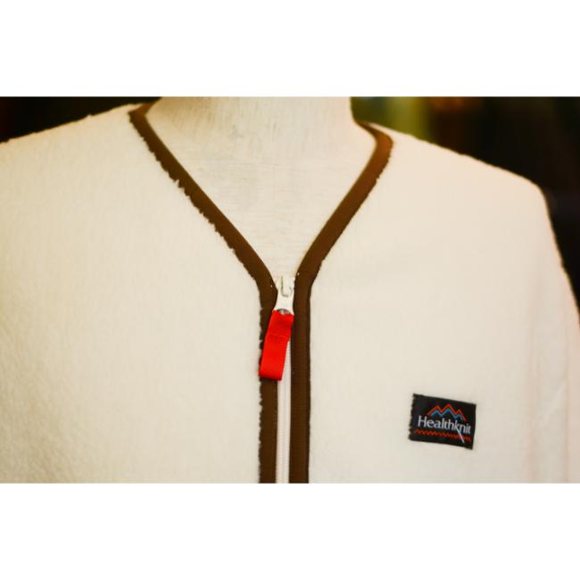 左胸のマウンテンロゴネーム、左袖のフラッグロゴワッペン、ファスナー引手に付いたHealthknitレッドのカラーテープがアクセントになっております。