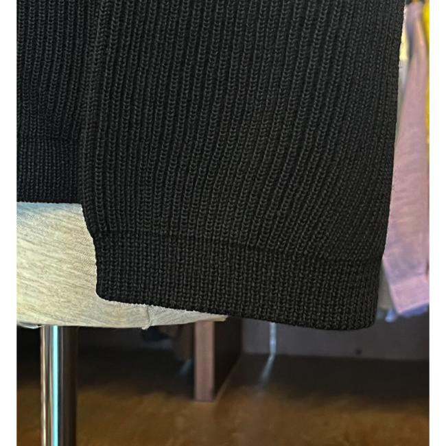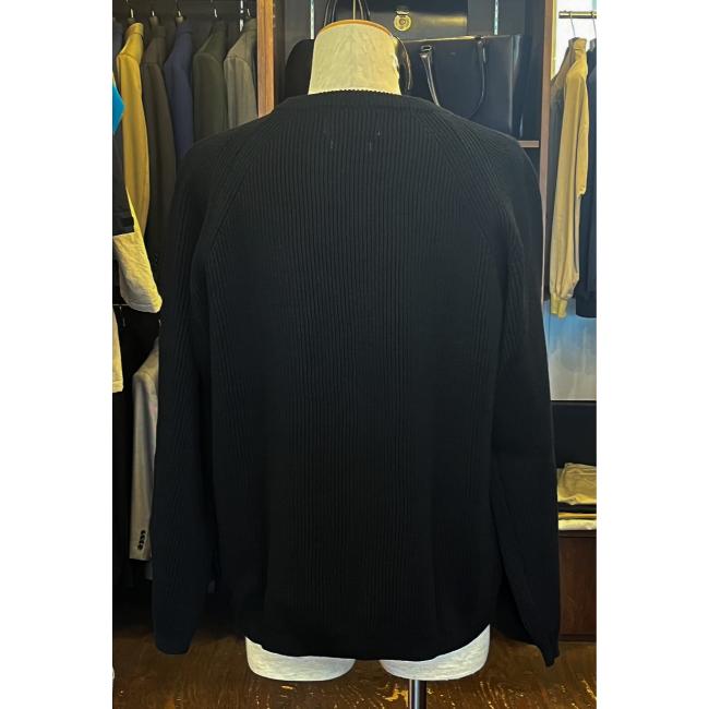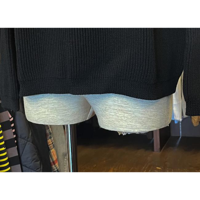 肩はラグランスリーブ、全体的に畦編み(リブ編み)になっているので、伸縮性に優れ、中にシャツなどを着てもふっくらせずにキレイに見えます。
