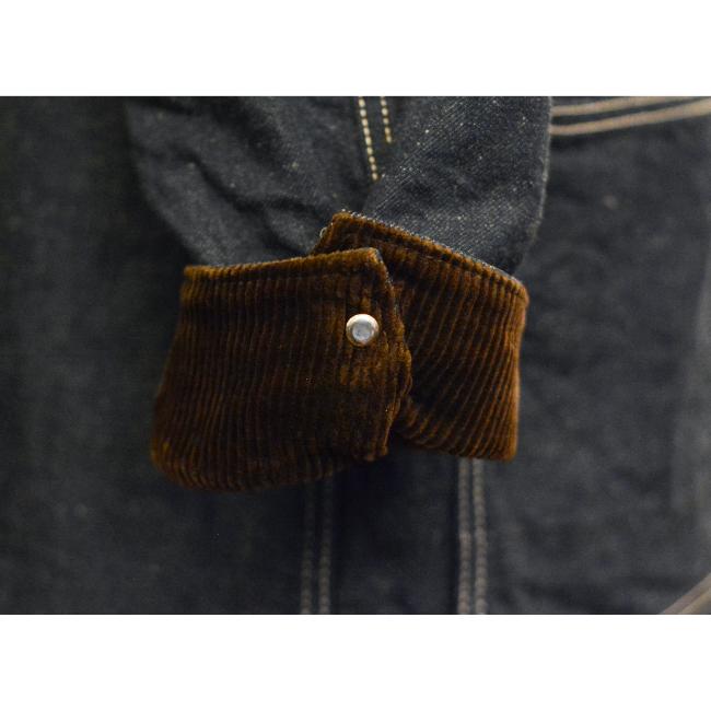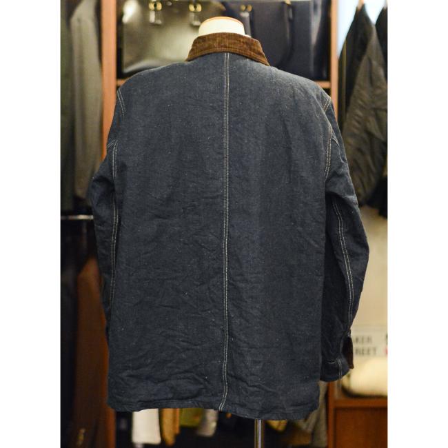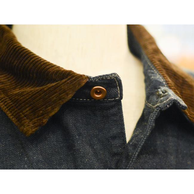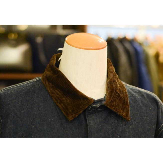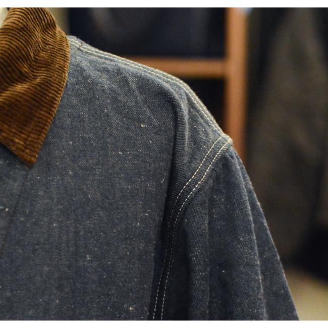 衿と袖裏はコーデュロイ仕様、ボタンは月桂樹ボタン、ワークタイプのリベットバーなどのディテールが盛り込まれたチョアジャケットです。