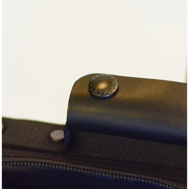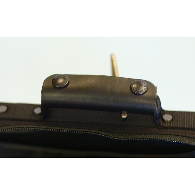 前面ファスナーには、YKK10号メタルファスナーを採用しており、メイン開口部の引手には、MA-1に採用されていたティアドロップ型の革引手を使用しております。メイン収納部には、柔軟性に優れたコイルファスナーが採用されております。