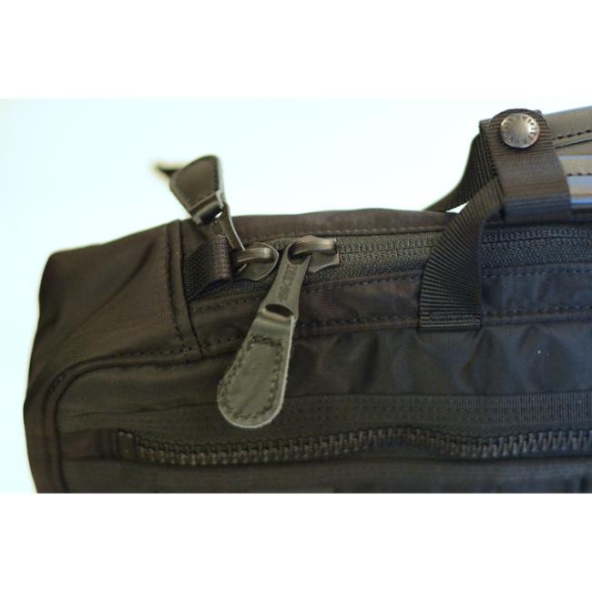 コーデュラ社のボンディング高密ナイロンをベースに、環境保護の観点からブルーサイン®基準を満たす認定工場で開発した、3層構造のオリジナル生地をメイン素材に使用しております。