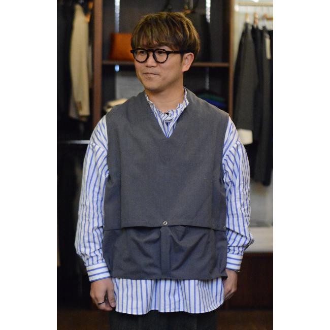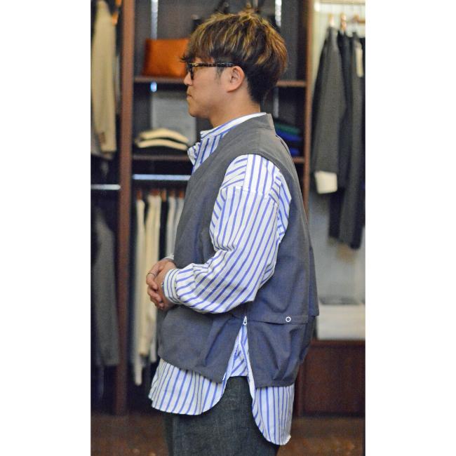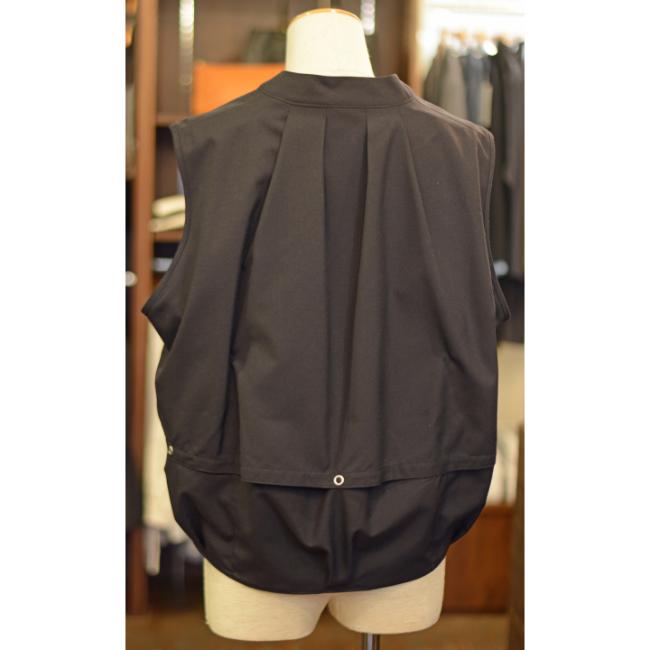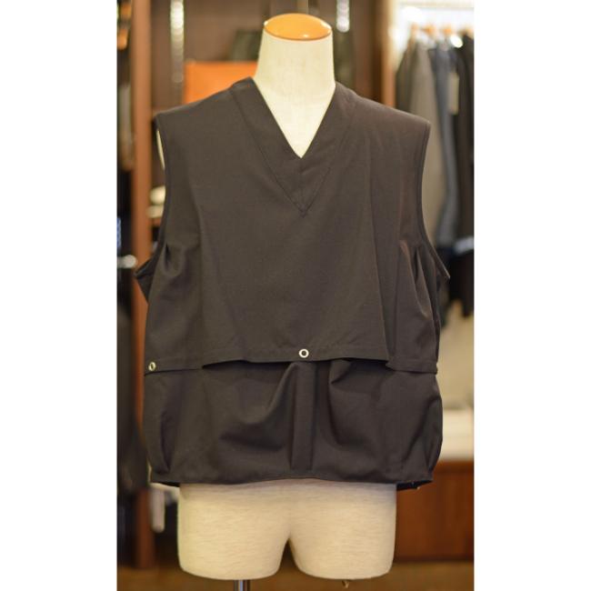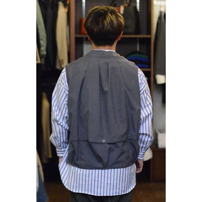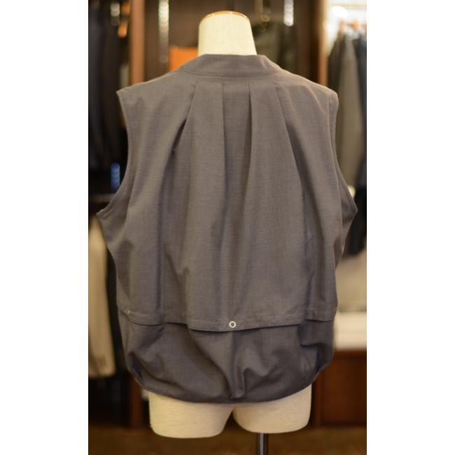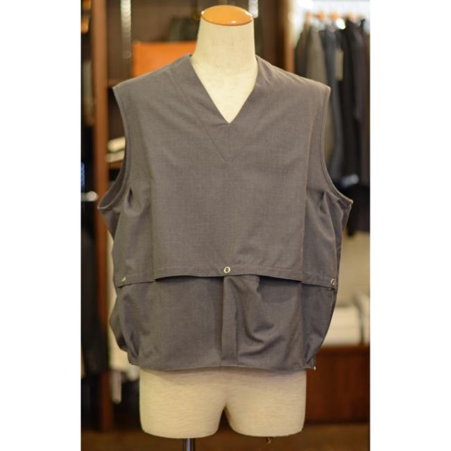 身頃まわりにプリーツポケットを連ねた、収納性の高いデザインが特徴のプルオーバーVネックベストです。