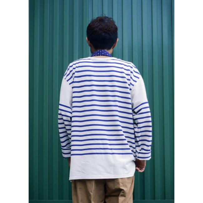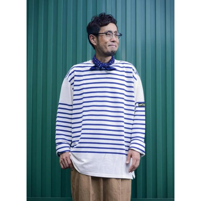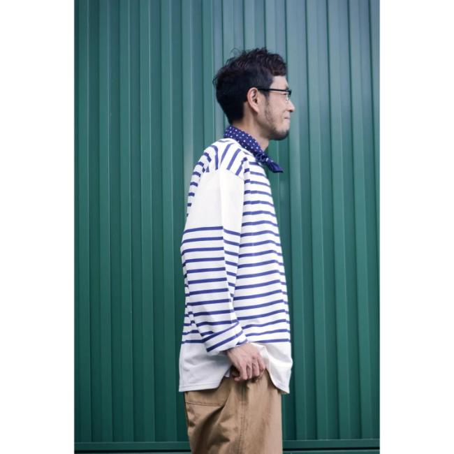 パネルボーダー柄の身頃と袖が各々違う配置になっており、他のマリンシャツにないデザインが特徴です。