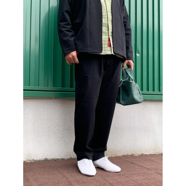 ワイドなシルエットながら裾口を少しテーパードをかけることで収まりの良いデザインとなっております。