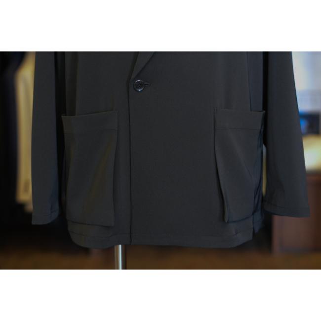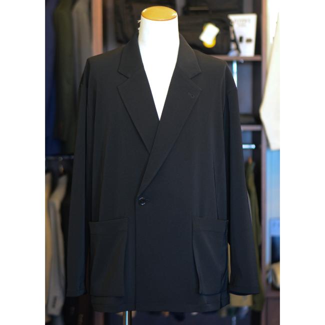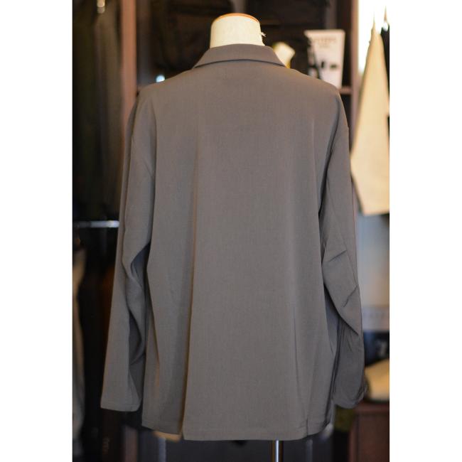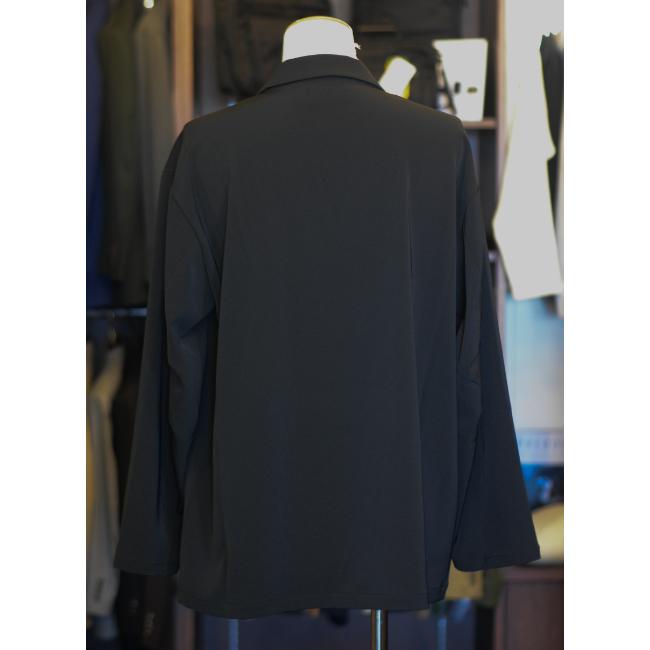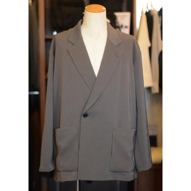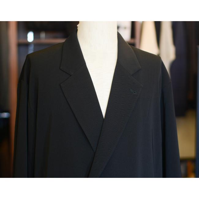 ポリエステルの強撚糸ならではの接触冷感性と軽い生地感が特徴のツイルを使用したオーバーサイズのダブルジャケットです。