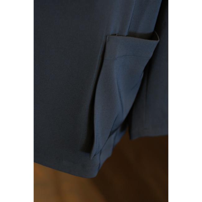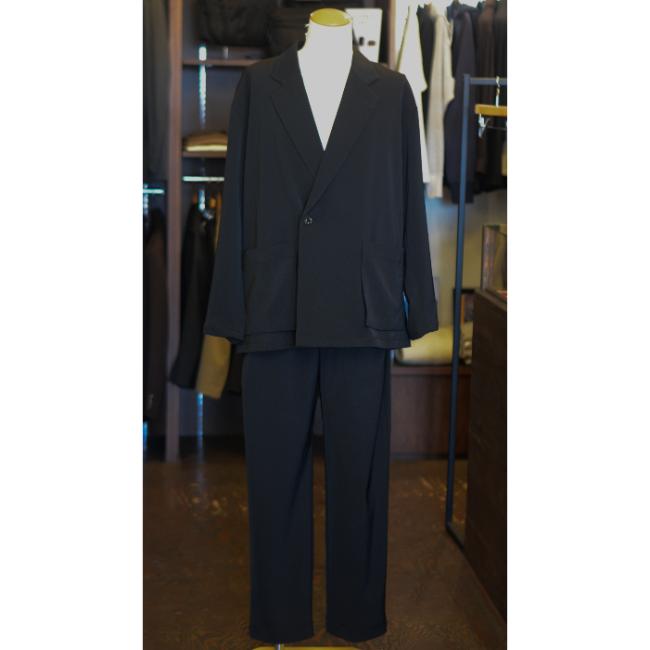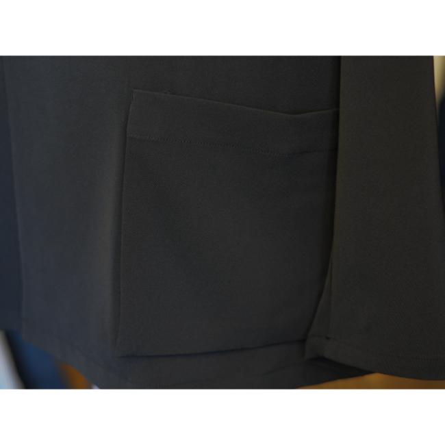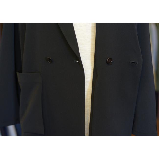 ラペルと胸の開きを大きく取った抜け感のあるオーバーサイズのシルエットに、1つ掛けボタンのダブル仕様の前立てのディテールが特徴の生地感と相まって大人っぽさを添えています。