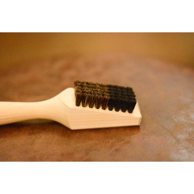 しみ抜きや頑固な汚れのこすり洗いには前方の黒馬毛を、通常の汚れのこすり洗いには全体を使用します。