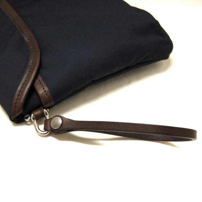 シャックルで着脱可能なストラップが付属しますので、バッグのハンドルに引っ掛けるもよし、手に通してクラッチとして持ち歩く事もできます。