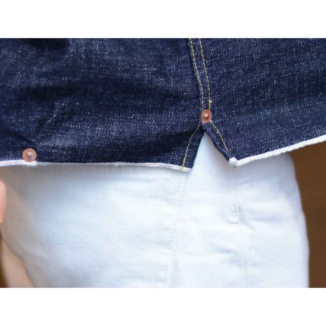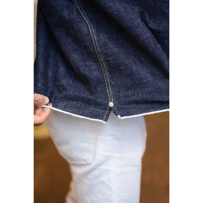 胸ポケット淵と裾にはセルビッチを配しており、さり気ないアクセントになっております。