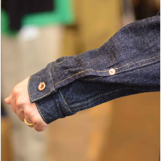 オリジナル刻印の銅リベットを補強面に数多く配し、フロントボタンは経年変化が楽しめる真鍮のドーナツボタンを採用。