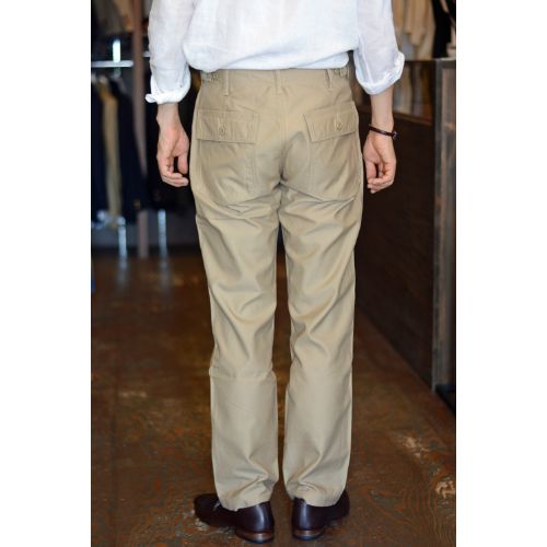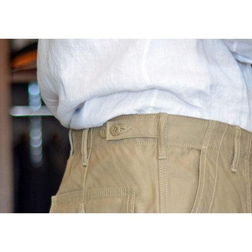 ウエストのアジャスター、フラットな尿素釦など当時のベイカーのディテールを踏襲しながらも、ジッパーフライで使いやすいように仕上がっています。