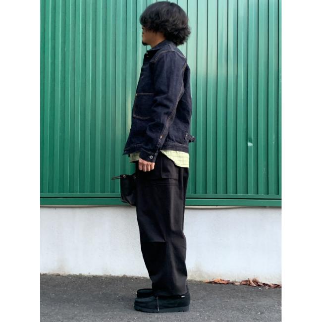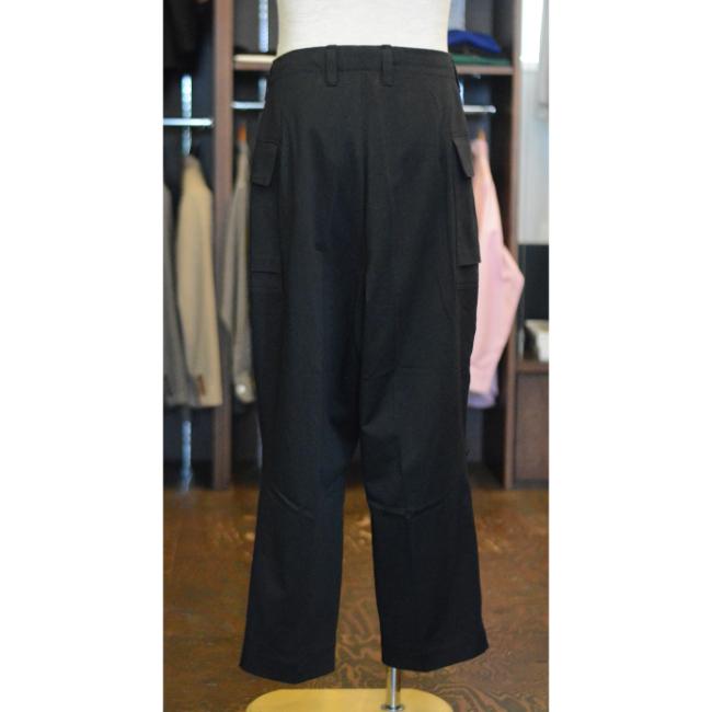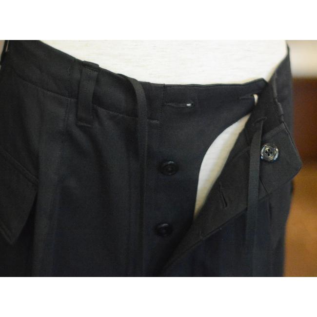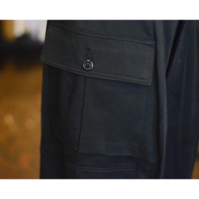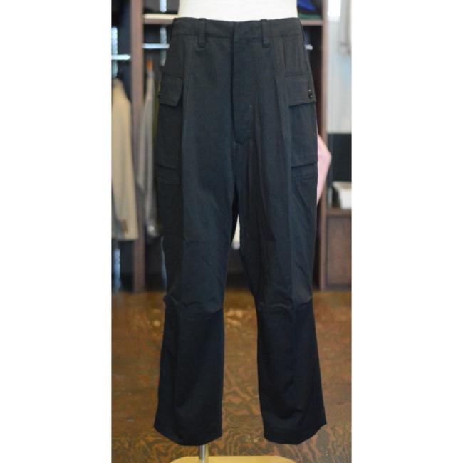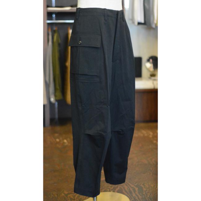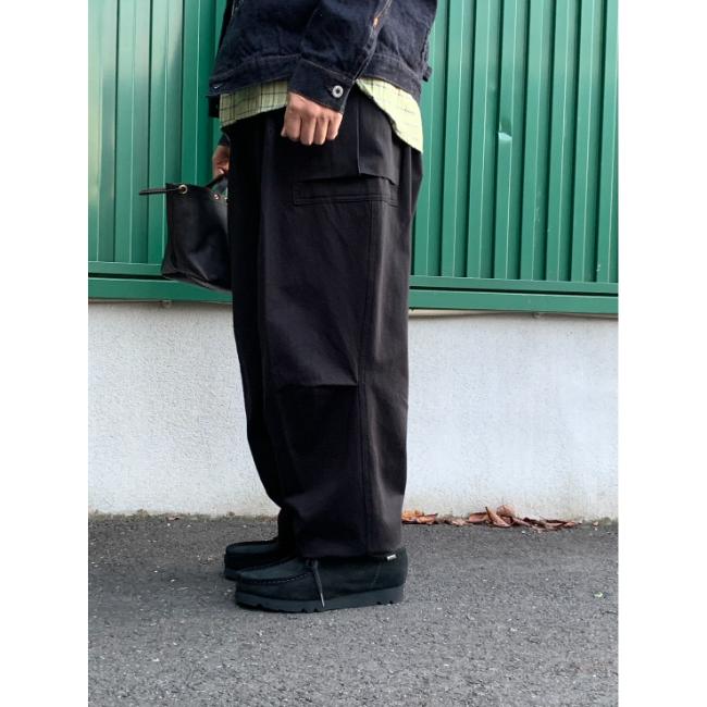 股上を深く設定したワイドシルエットに、膝のプリーツからテーパードになる様に仕上げられたミリタリーパンツです。