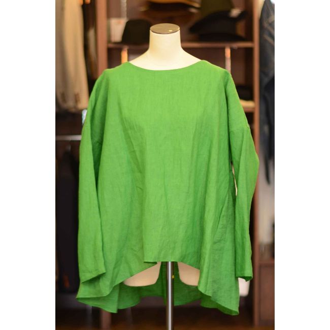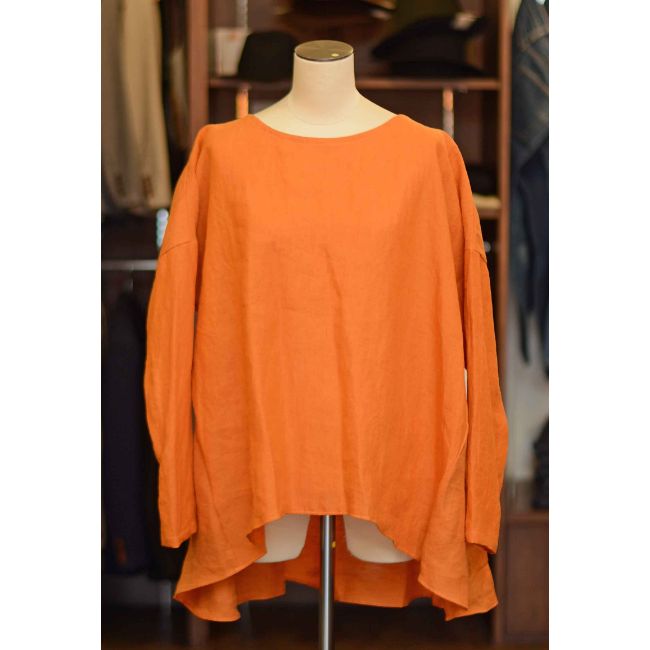 後身のヨークから贅沢にギャザーを全面に入れることで、背面のドレープがエレガントな、Aラインに仕上げたクルーネックシャツです。