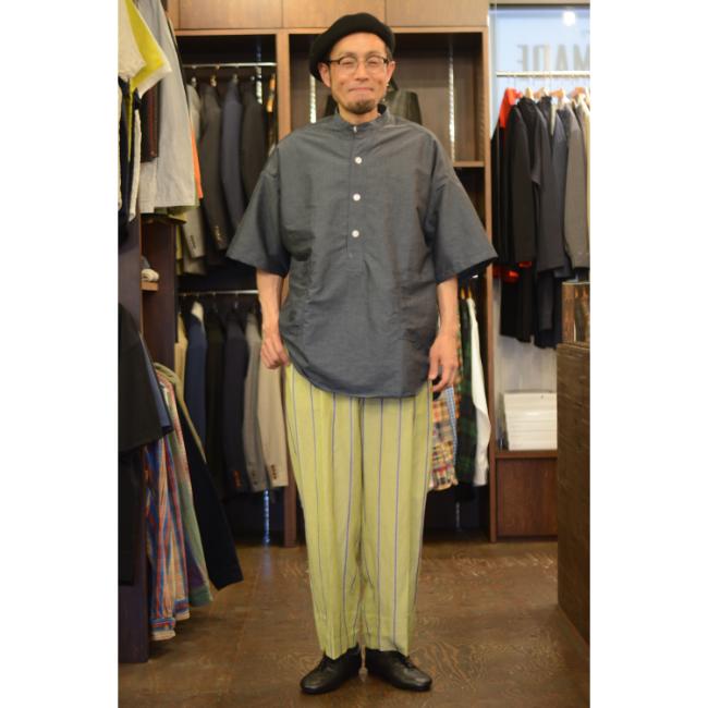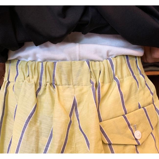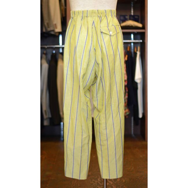 フロントはボタンフライ、ウエストには後身にゴムシャーリングを施し、フロントの持ち出しベルトで調整できるイージーパンツ仕様です。