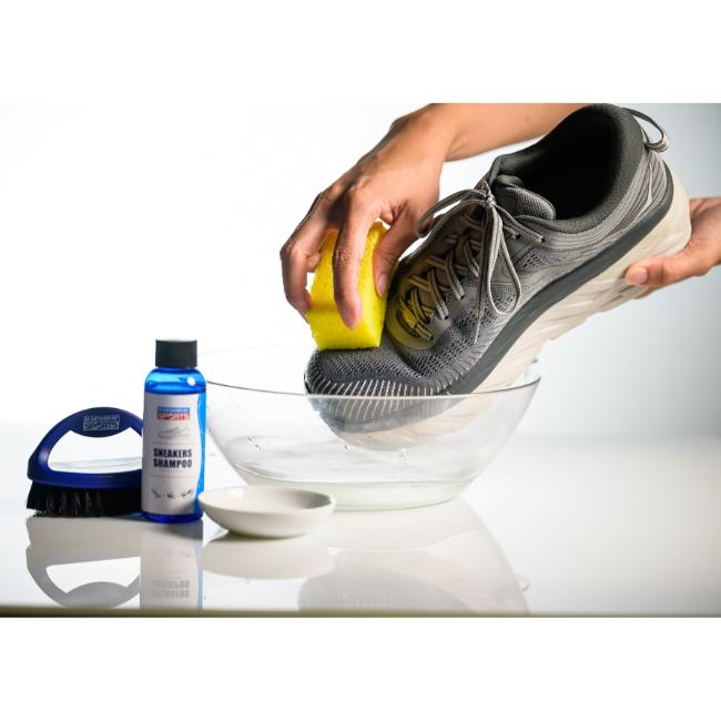 スムースレザー、スエード、キャンバス、布地、ナイロンのスニーカー、スポーツシューズ、サンダル用の他、合成皮革にも使用できるシャンプーです。
