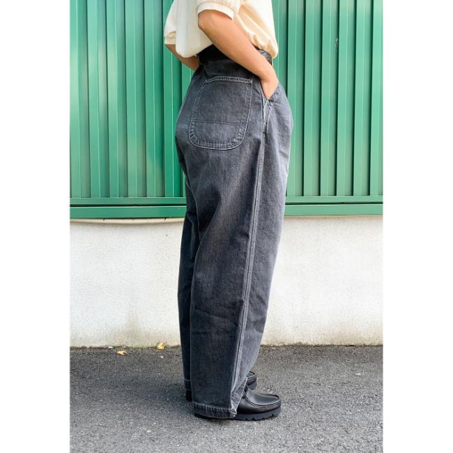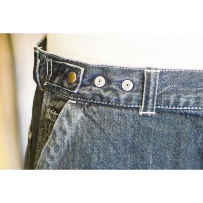 オーバーオールのパンツ部分が独立したようなデザインのブラックデニムパンツ