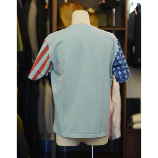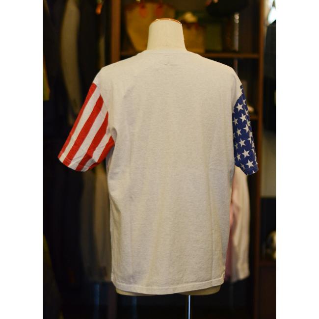 袖の星条旗柄やフロントプリントには程良く掠れ感を持たせており、数年着込まれたかの様なフェード感を演出しております。