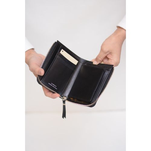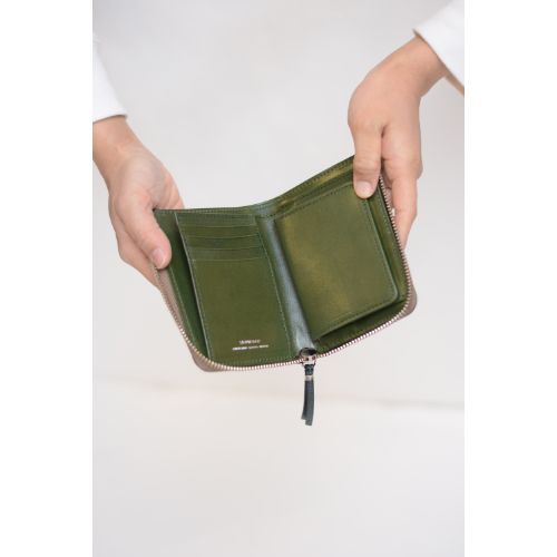 使い易いボックス型の小銭収納が付いたL字ジップ式。お札の収納もセパレートになっているので、領収書なども管理しやすいです。長財布ほどかさばらず適度な容量が入ります。