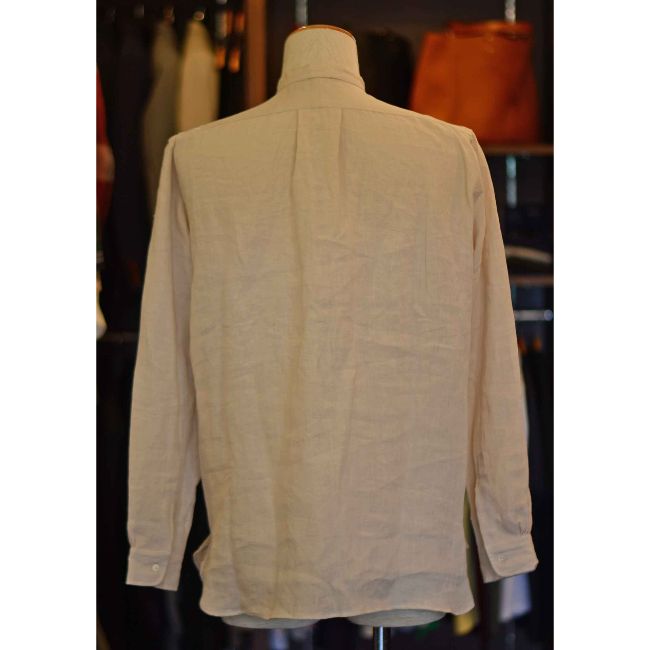 普段は作業着として着用し、正装のときに襟を付けて着ていた昔の時代の名残を残し、第1ボタンはホールだけのデザインです。