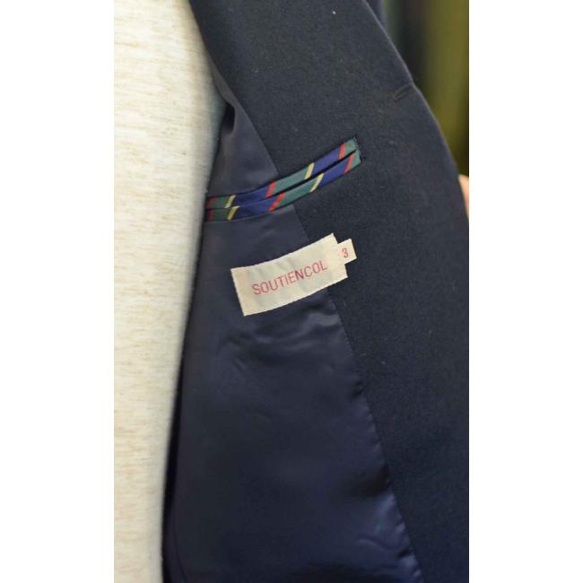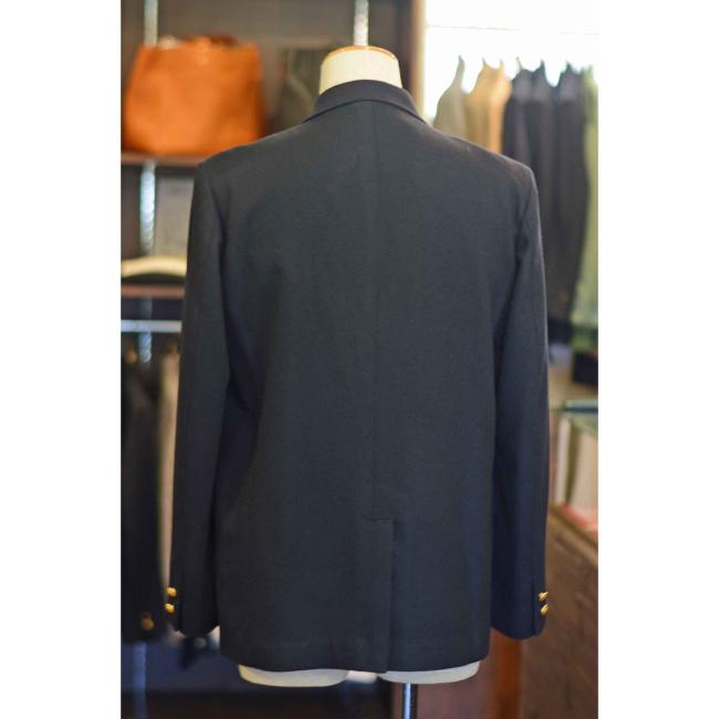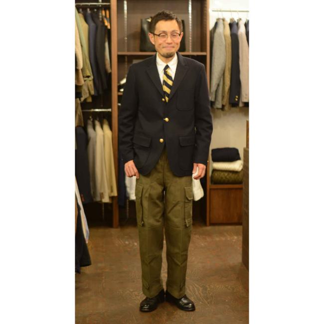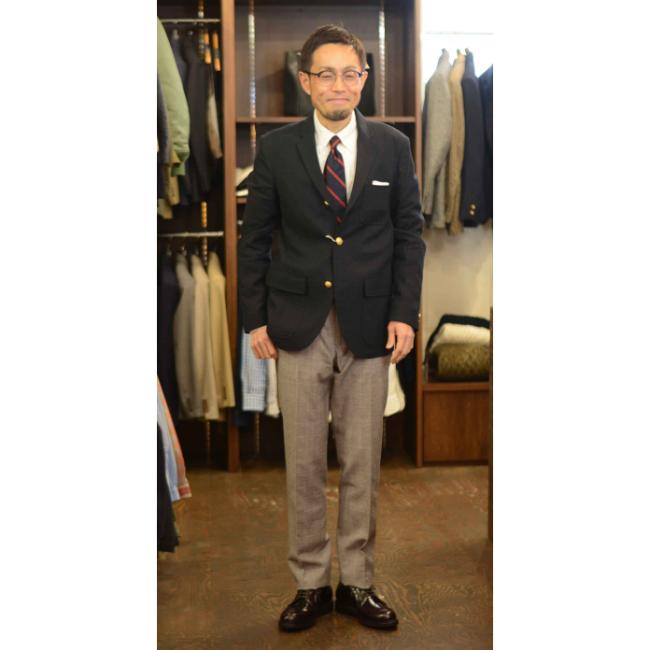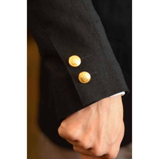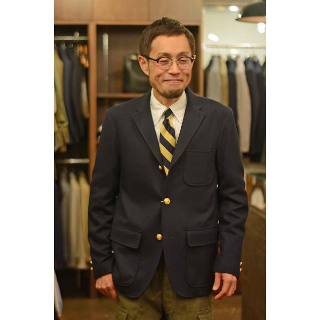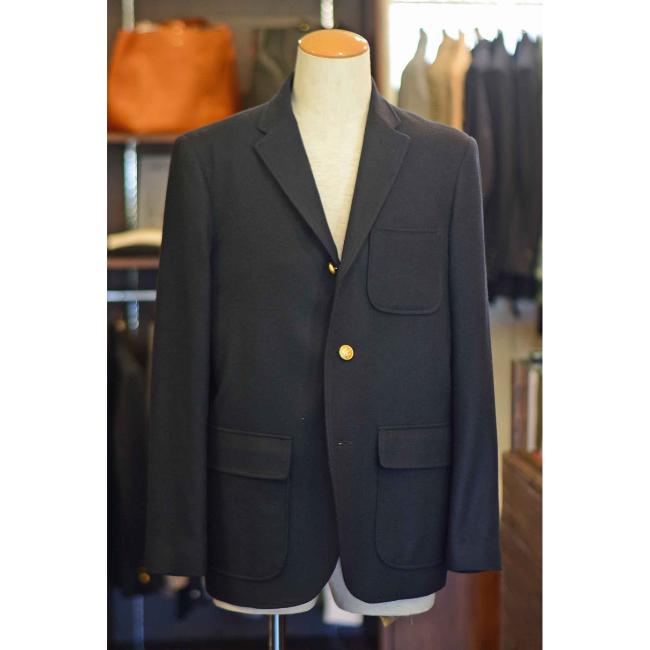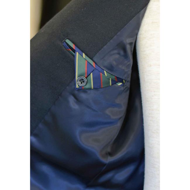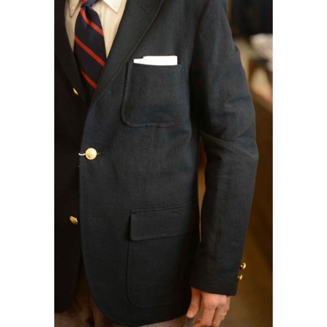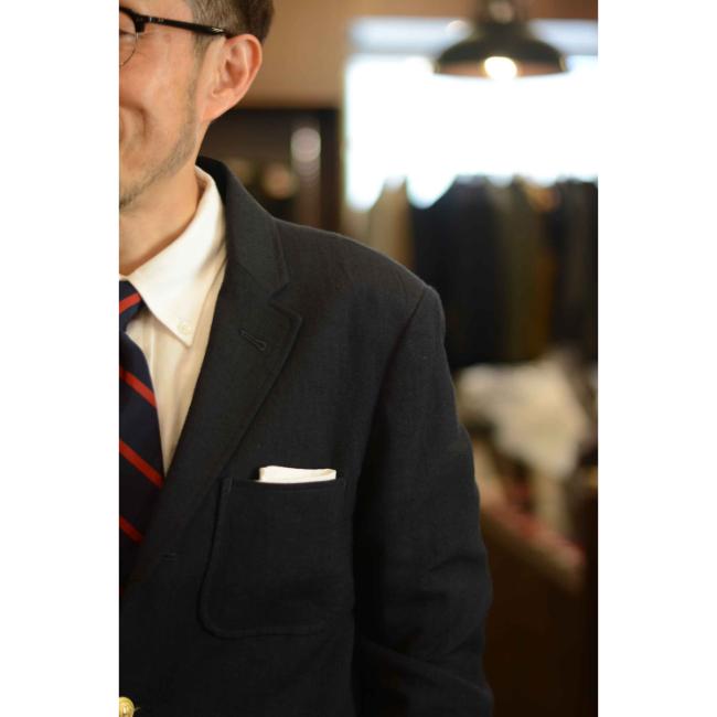 メタルボタンは今は製造されていないデッドストックのメタルボタンを使い、内ポケットの玉ブチにはレジメンタルストライプが施され、デザイナーの拘り色が濃い紺ブレです。