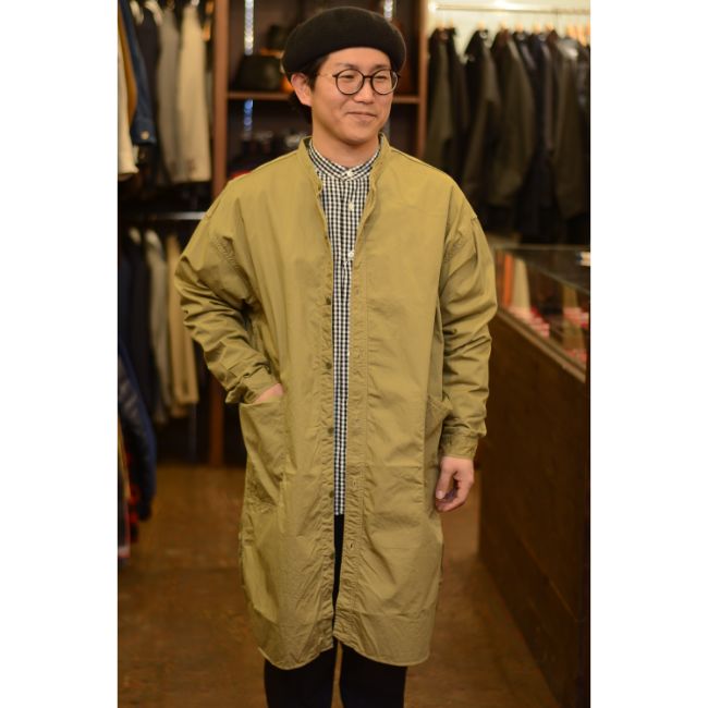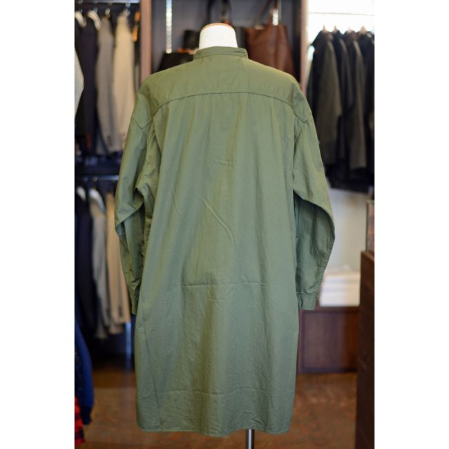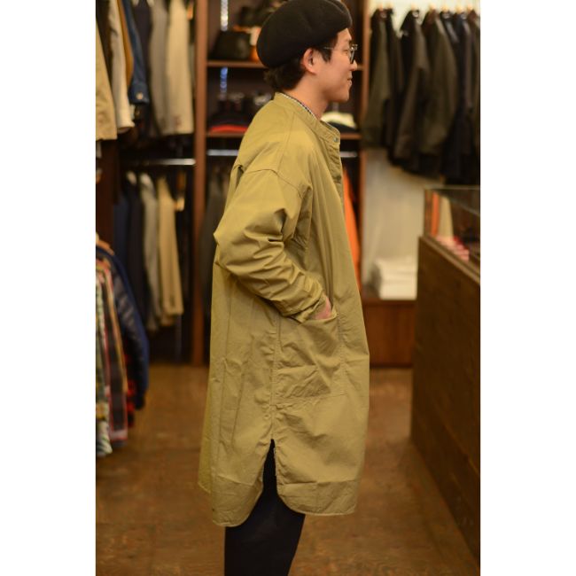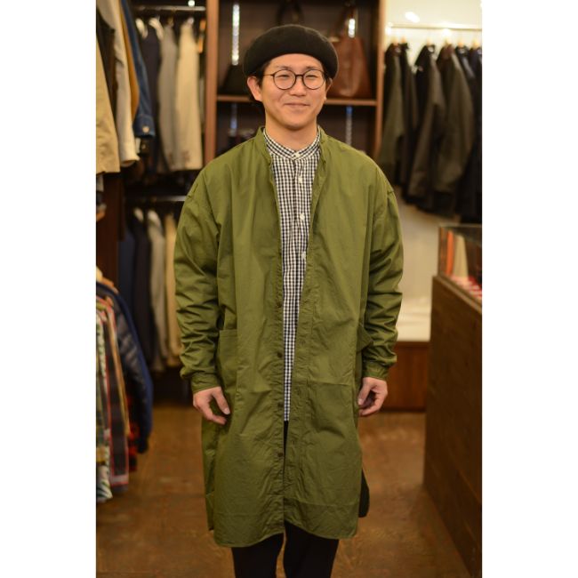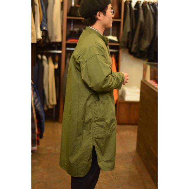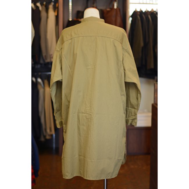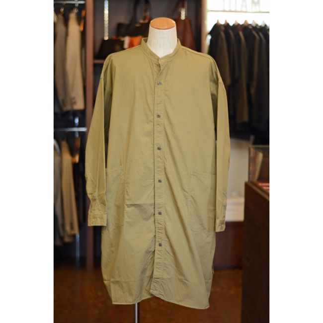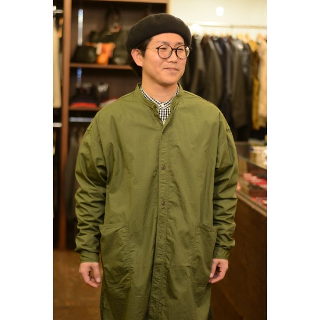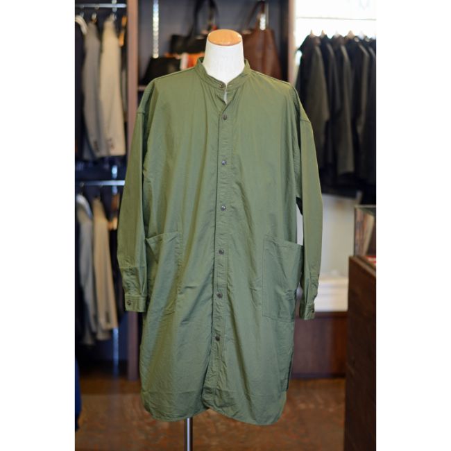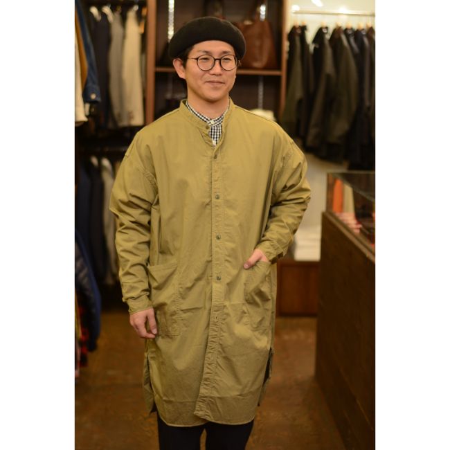 衿はすっきりと立ち感のあるデザインが特徴のバンドカラー、フロントには大き目のパッチポケットが両サイドに付いています。