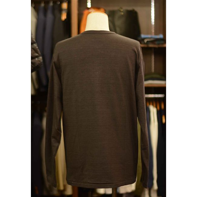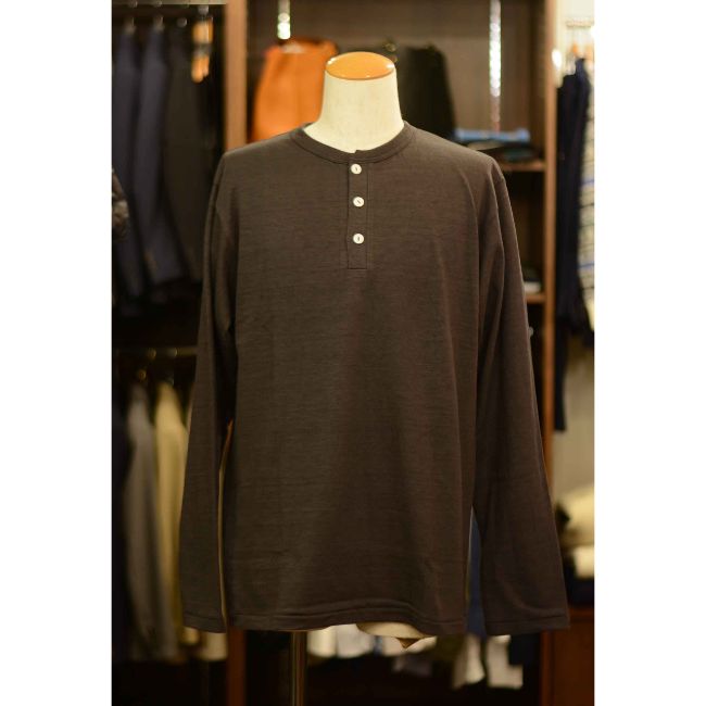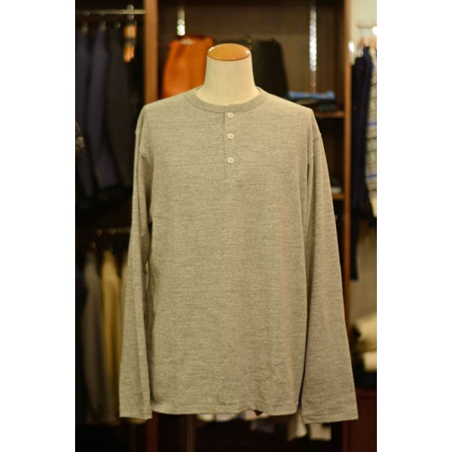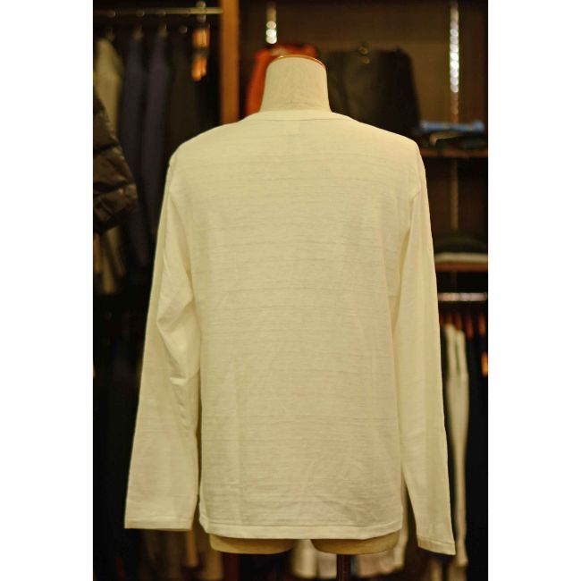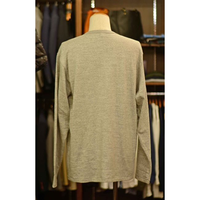 12番のムラ糸で独特の陰影が出るように編まれたこの生地はシャドウボーダーと呼ばれており、無地でありながらうっすらと横段のようなムラが浮かびます。