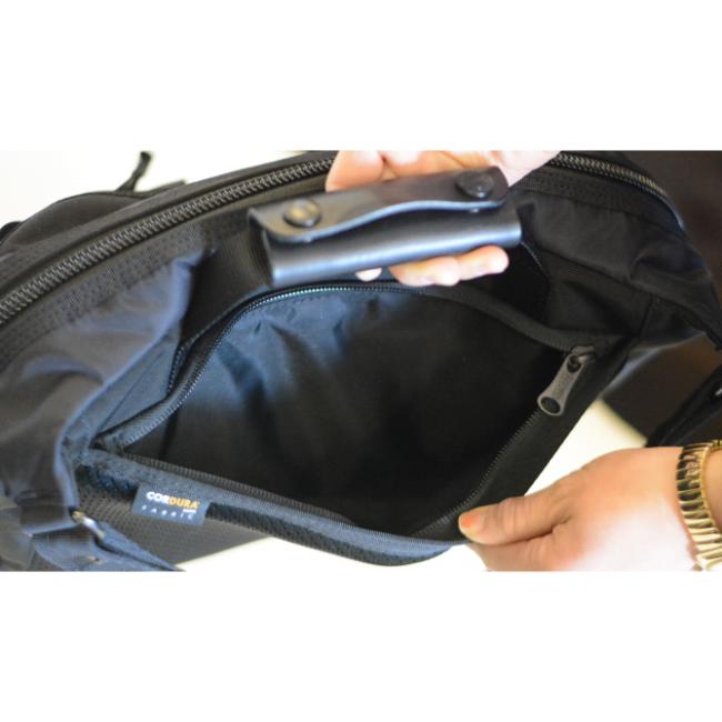 本体フロントにはワイヤレスイヤホンサイズのフラップポケットが配置され、ポケットサイドに設置した落下防止の二重リングに鍵などを引っ掛けて収納ができたりと、使い勝手の良さが実感できる仕上りになっております。