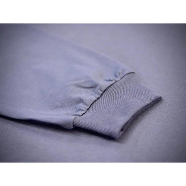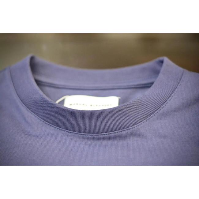 32/1の微強撚糸を引き揃えて編んだほどよく厚みがありながら、しなやかさ、光沢感のあるハイゲージの天竺(コットン100%)を使用しております。