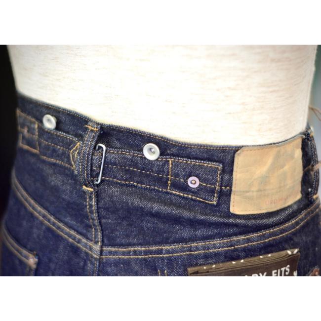 ウエスト部分のサスペンダーボタン、シンチバック、バックポケット口はリベットを表から打たれています。